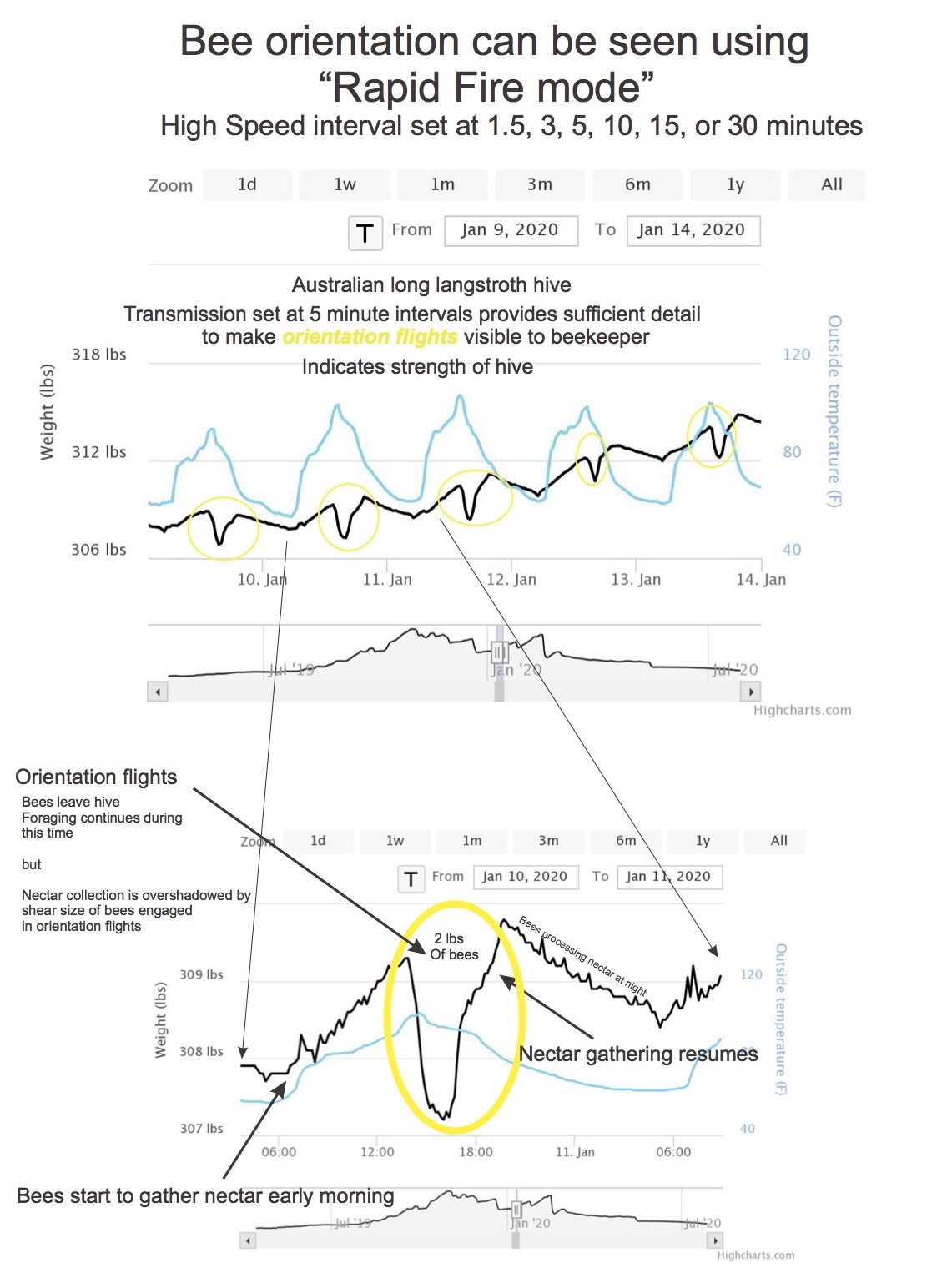 Eggs are laid and new bees emerge from their cell 20 days later and take their first orientation flights a further 20 days later. Orientation means the hive was laying eggs or queenright at least 40 days previous. HIve Scales show those orientation flights when often several thousand bees orientate at one time. As bees weigh approximately .1 of one gram, the weight reduction of the hive during orientation tells us how many new foragers have hit the blossoms and how well the queen has been laying.