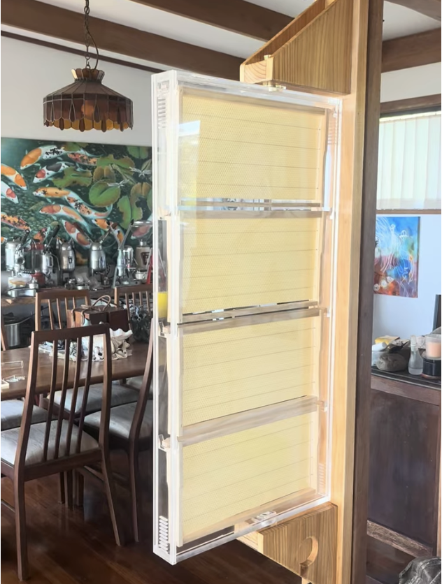 A nuc size transparent indoor observation hive with the queen visible every time you look